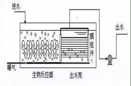 把膜组件置于生物反应器内部。进水进入膜--生物反应器,其中的大部分污染物被混合液中的活性污泥去除,再在外压作用下由膜过滤出水。