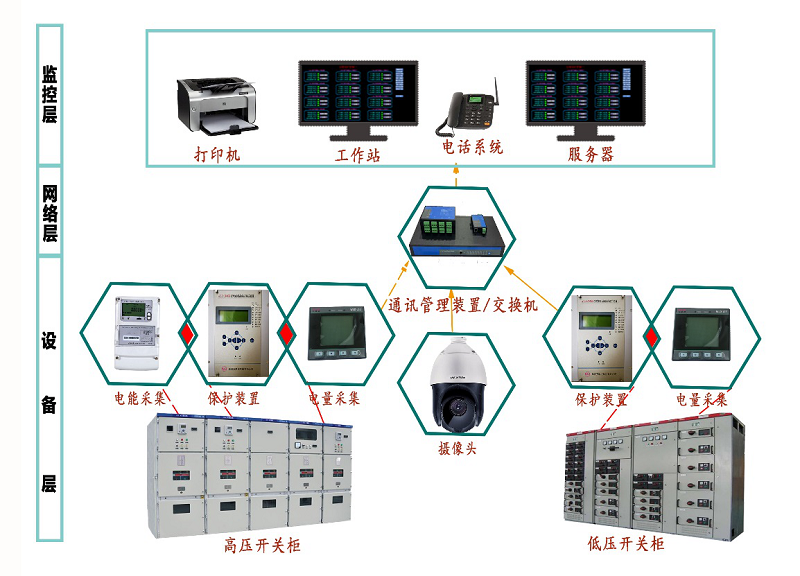 智能变配电综合自动化系统采用分层、分布式结构设计,整个监控系统分为监控层、通讯层、设备层。系统通过现场总线、工业以太网等实现数据互联,其容量大、速度快、实时性好、开放性好,具备良好的可扩展性。