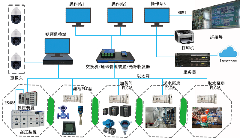 取水泵房、加矾加氯处理站、沉淀滤池处理站、送水泵房、视频监控系统、中控室、水处理设备、配套高低压柜等组成。